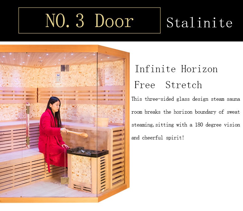 يتميز هذا الزجاج بشكل مبتكر بهيكل باب زجاجي خاص من ستالينيت ثلاثي الجوانب، ويخضع لمعاملة خاصة لدرجات الحرارة العالية، مما يوفر مقاومة رائعة للحرارة ومقاومة للصدمات. فهو يحافظ على الثبات حتى في درجات الحرارة التي تتجاوز 70 درجة مئوية داخل الساونا، مع شفافية عالية للغاية وبدون تشويه بصري. يحقق التصميم الزجاجي ثلاثي الجوانب رؤية واسعة دون عائق بمقدار 180 درجة، مما يكسر تمامًا الشعور الضيق والمغلق للساونا التقليدية. يمكن للمستخدمين الحفاظ على الاتصال البصري مع البيئة الخارجية أثناء الاستمتاع بالساونا، مما يجعلها مثالية للشرفات المنزلية والساحات وغيرها من السيناريوهات - مما يسمح لك بتقدير المناظر الخارجية أثناء تجربة العلاج الحراري للحصول على ذهن وجسم أكثر استرخاءً وراحة. بالإضافة إلى ذلك، يخلق نظام أجواء ضوء النجوم المتكامل داخليًا تأثيرًا نجميًا متلألئًا من خلال شرائط إضاءة LED المخفية على الجدران العلوية والجانبية. يكمل الضوء الناعم البخار الدافئ، مما يخفف من إجهاد العين بشكل فعال ويعزز جو الساونا الغامر والممتع.
