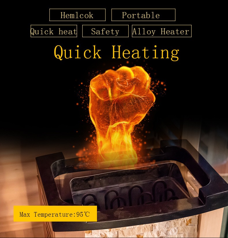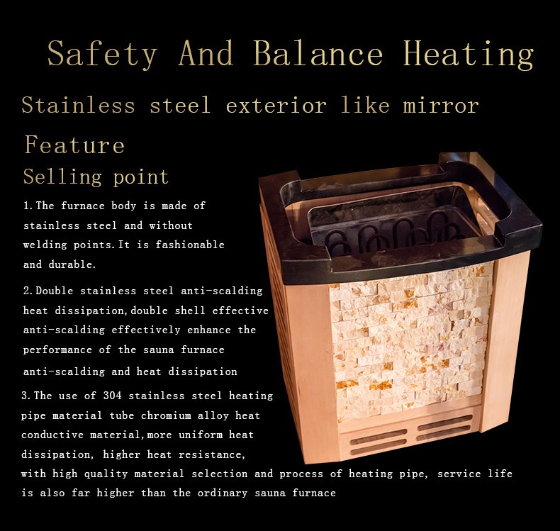 بالإضافة إلى ذلك، تم تجهيز سخان الساونا بجهاز حماية من الحرارة الزائدة والذي يتم إيقاف تشغيله تلقائيًا عندما تتجاوز درجة الحرارة عتبة الأمان، مما يضمن كفاءة التسخين وسلامة المستخدم.