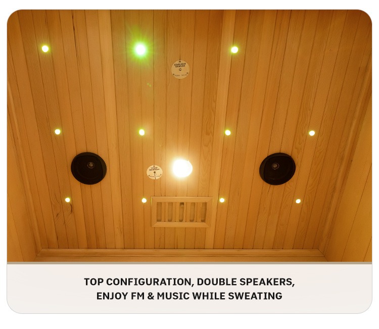 تم تكوين نظام مكبر صوت مزدوج في الأعلى، ويدعم راديو FM وتشغيل الموسيقى. يمكنك الاستمتاع بألحانك المفضلة أو برامج الراديو أثناء التعرق، مما يؤدي إلى تحسين تجربة الساونا الغامرة.