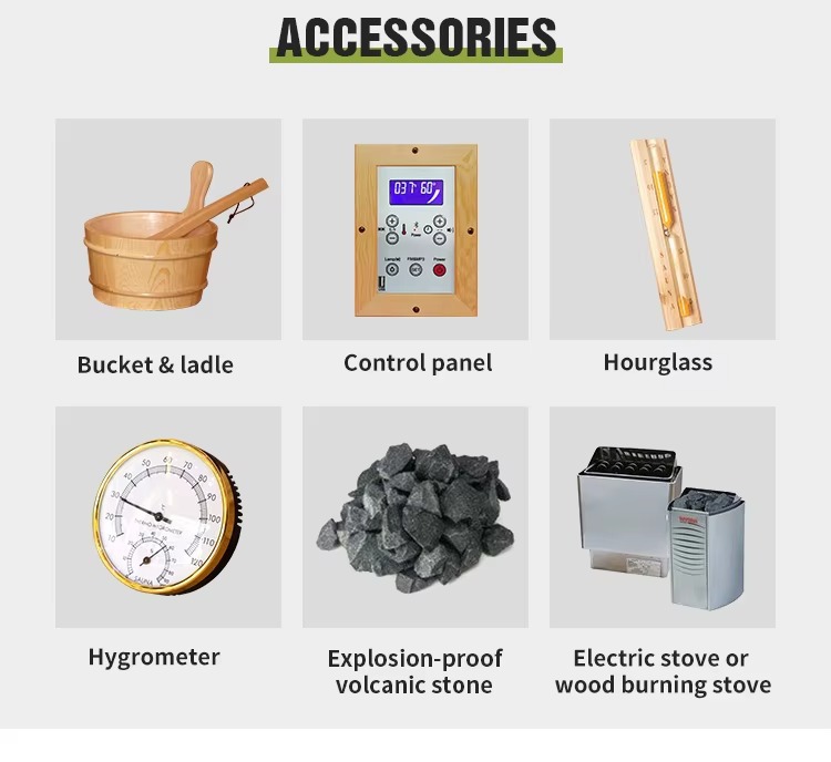 • الداخلية: مغلفة بالكامل بالخشب الصلب + أضواء محيطة ناعمة، ومجهزة بطاولات ومواقد ساونا احترافية، مما يخلق جو ساونا دافئًا ومريحًا