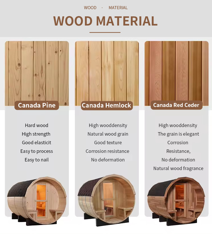 • تخصيص الخشب: يختار خشب كندي مستورد عالي الجودة خاص بالأماكن الخارجية - الصنوبر (صلابة عالية، فعال من حيث التكلفة، معالج ضد التآكل)، الشوكران (كثافة عالية، مقاوم للرطوبة ومقاوم للتشوه)، والأرز الأحمر الغربي (مضاد للتآكل بشكل طبيعي، مع رائحة الخشب الطبيعي، متانة قوية في الهواء الطلق)، لتلبية متطلبات مقاومة الطقس للبيئات الخارجية المختلفةغرفة بخار خارجية بباب زجاجي خارجي.
