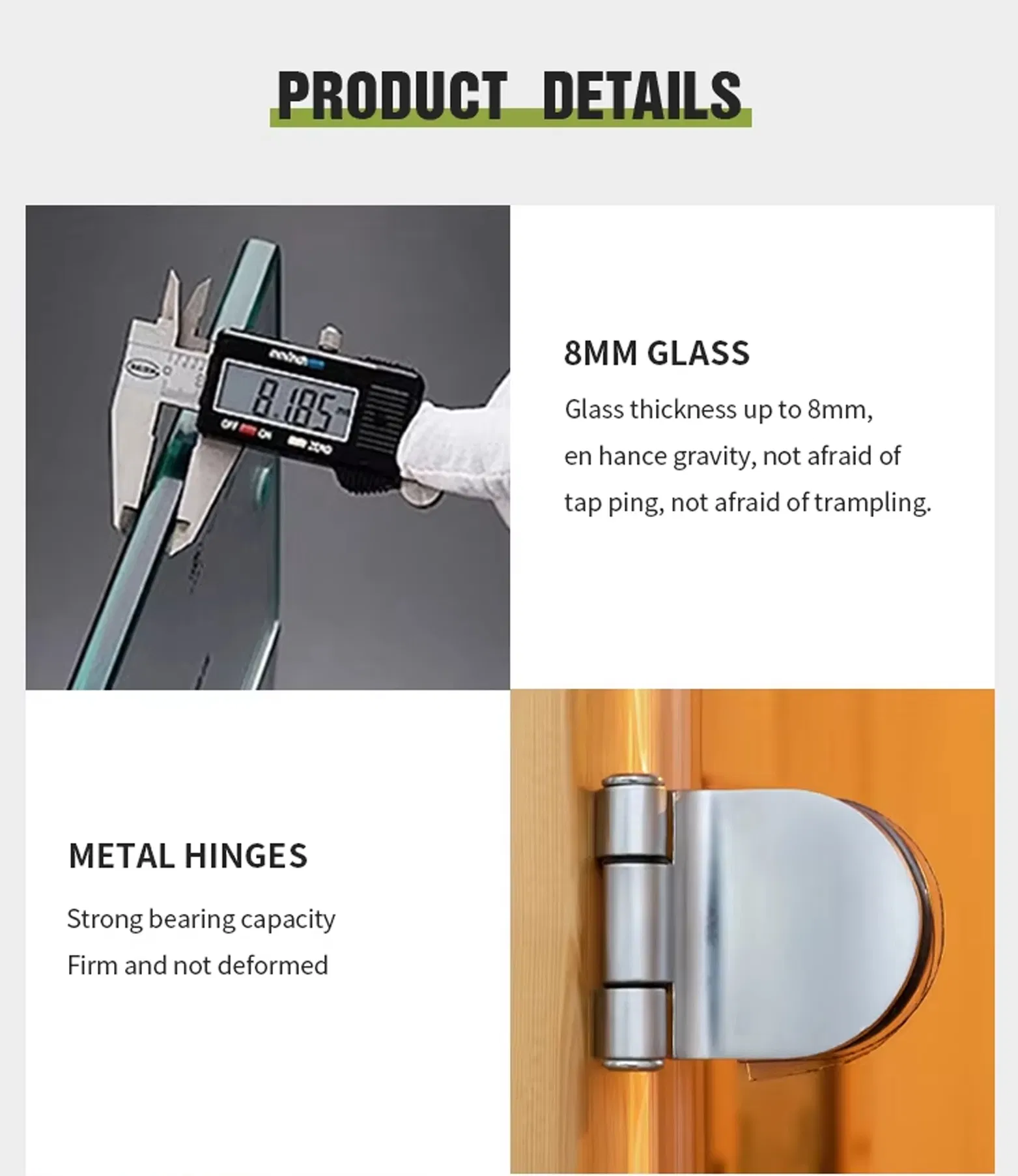 - مفصلات معدنية شديدة التحمل - مفصلات من الفولاذ المقاوم للصدأ بسعة تحميل 100 كجم، مما يضمن بقاء بابك ثابتًا لسنوات.